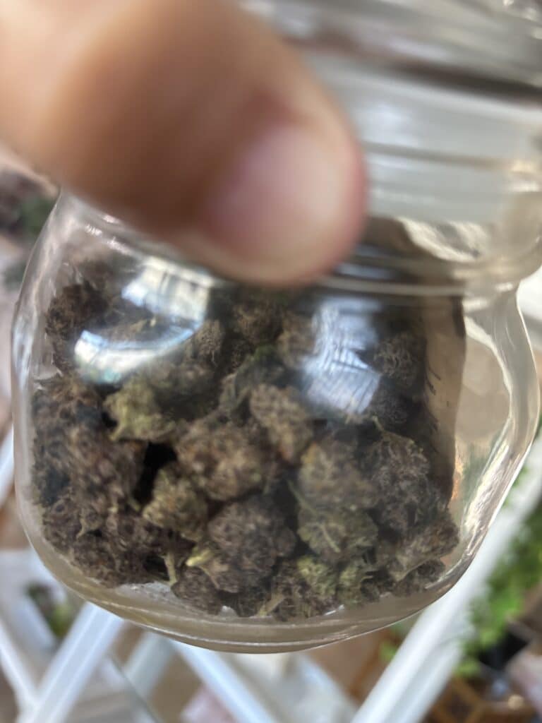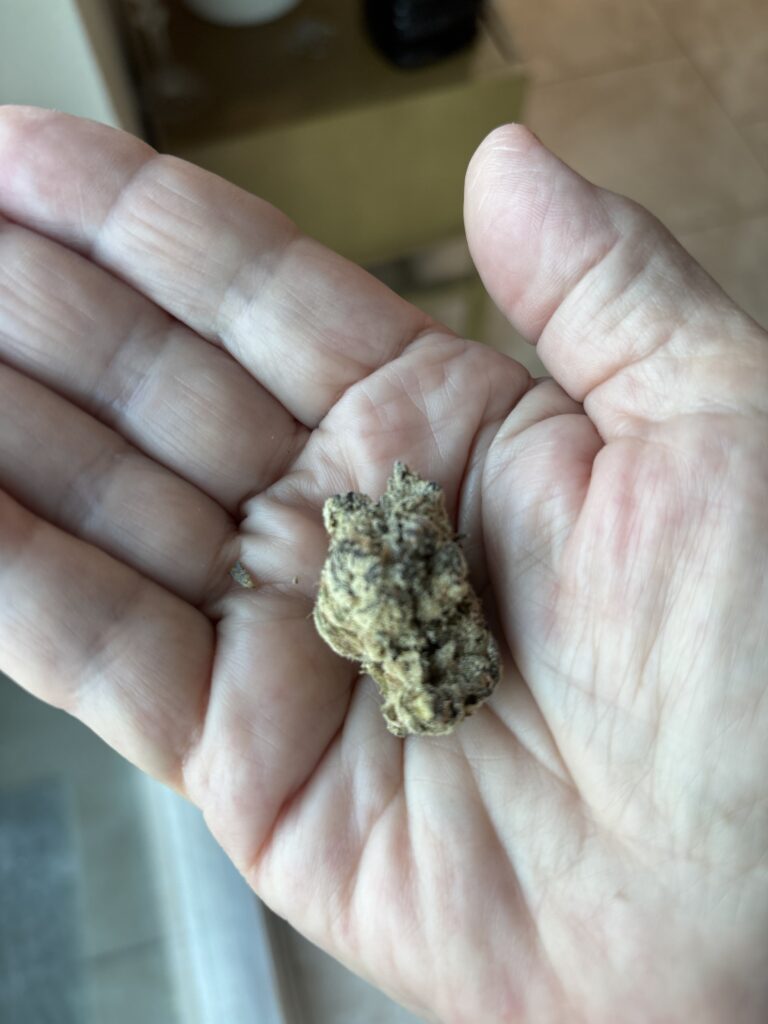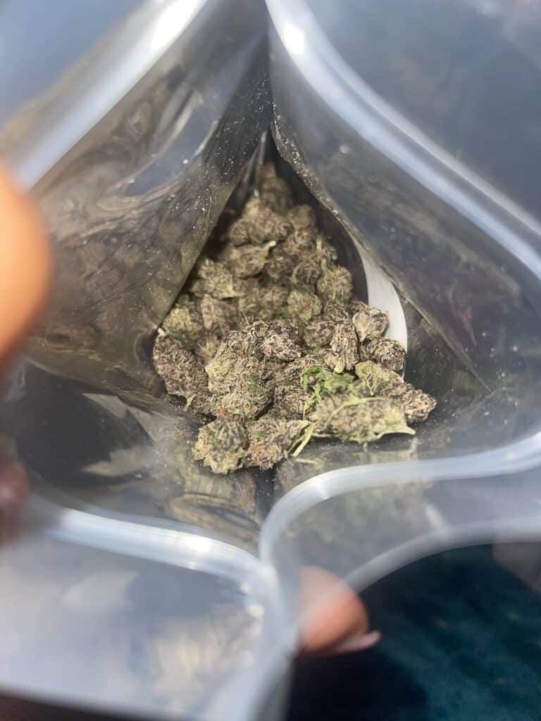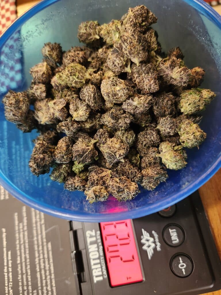 These tiny beautiful purple nugs are very tasteful. The hit is nice and smooth. And the buzz in definitely top shelf. This compares to any exotic at half the price. Better not let this deal go by. And it almost weighed.😁 hahahahaha I burnt one out of it so it weighed over!‘!!