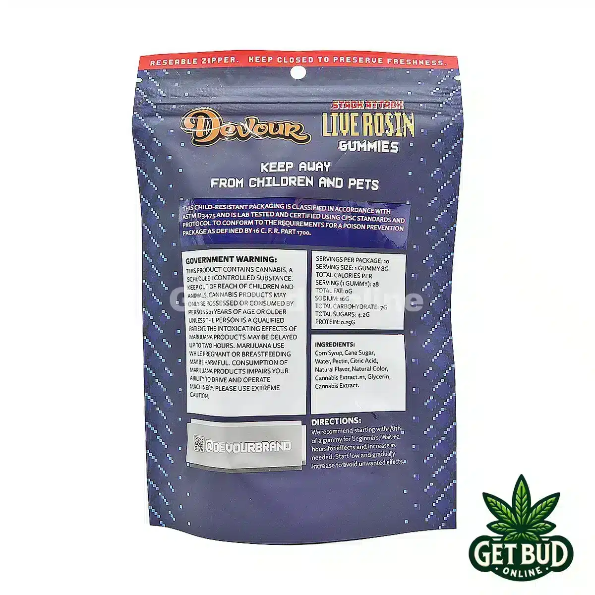 Devour Stack Attack Live Rosin Gummies bring a fun twist to the usual gummy lineup, pairing bold potency with a unique dual-flavor combo in every piece. Each gummy mixes two complementary flavors into one, keeping things a bit more interesting. Made with live rosin infusion, these gummies keep more of the plant’s natural profile. Each pack comes with 10 300mg pieces.