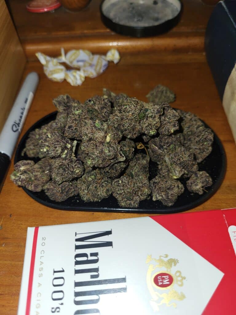 The flower smells like heaven full of flowers. The buds a a beautiful purple and dense. It is not dry and grinds and smoke very smoothly. The flavor on the pull and exhale are a prelude to the nice stoned buzz