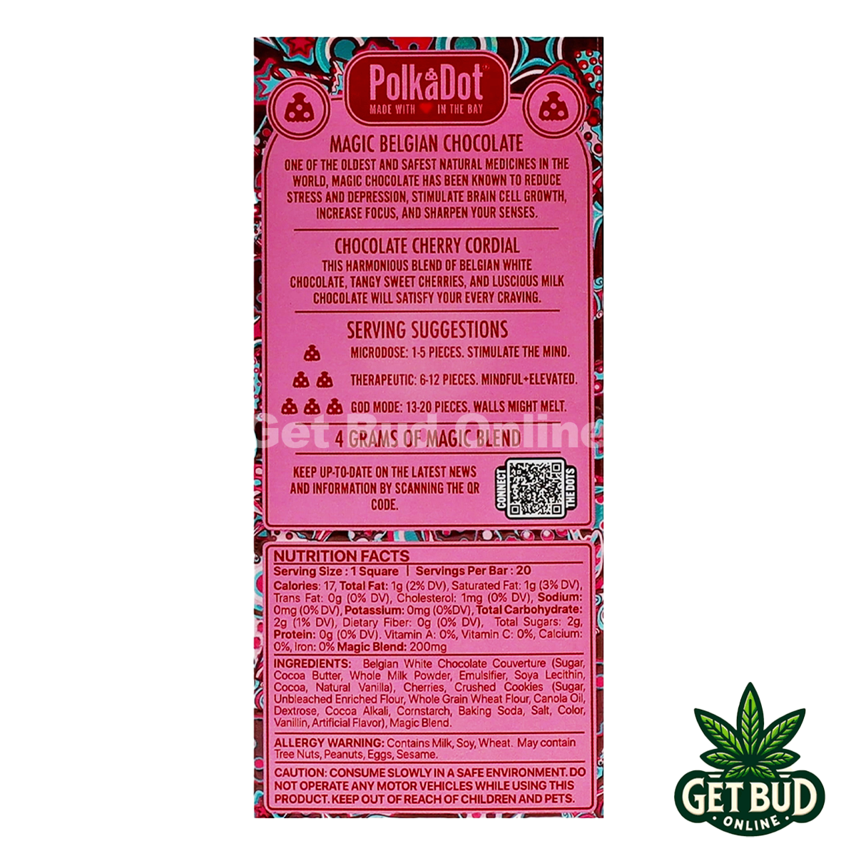 Whether you’re looking to enhance your mood, spark your imagination, or simply relax, the Polkadot Chocolate Cherry Cordial bar delivers a premium, indulgent experience like no other. Treat yourself to this unique blend of taste and adventure.